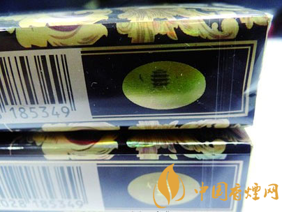 真品小盒正反面均采用具有黄色、红色、紫色、蓝色和绿色等干涉色的效果珠光油墨,在不同光线角度下会呈现出不同颜色,同时也具有能阻止扫描仪、电分机及彩色复印机的复制功能;假烟在不同光线角度无法呈现出彩色光线变化,因多采用高清扫描复制,其图片多边缘呈现颗粒粗大的网格状,与真品材质存在显著差异。