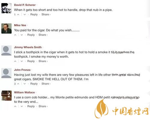 5、 William Wallace:我用玉米棒来装抽到很短的雪茄,这个方法可以让我的蒙特小艾蒙多和HDM小罗布图抽到非常非常短的程度……