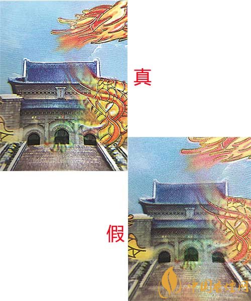 三、看底纹差异真烟小盒正面天空波浪纹、中山陵屋顶瓦片清晰连贯;假烟小盒正面天空波浪纹、中山陵屋顶瓦片模糊不清,时有时无。