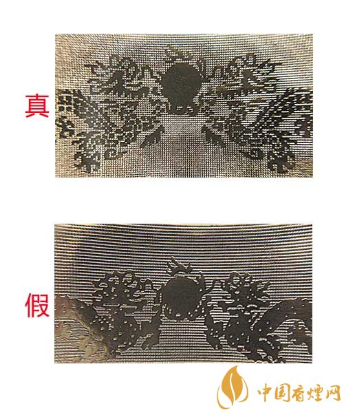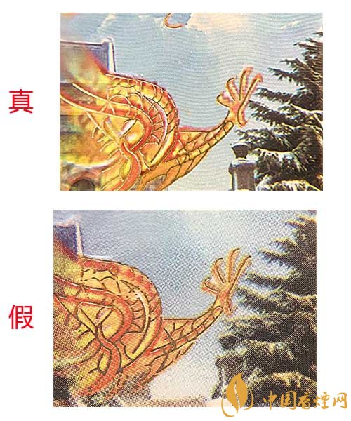 二、看印刷差异真烟小盒正面龙纹和松枝印刷清晰,色彩饱和度高,有立体感;假烟小盒正面龙纹和松枝印刷模糊,无立体感,且有粗糙圆形图案。