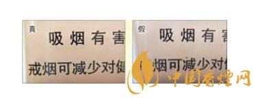 三、小盒正面警示语印刷工艺差异对比真烟警示语印刷字的边缘干净,商标纸底色色原点为点状微小颗粒,印刷细腻,如警示语第一个“吸”字的最后一笔捺,起笔点是平头状;假烟警示语印刷字的边缘有均匀的锯齿状虚边,商标纸底色色原点为不规则的点,颗粒大,印刷不均匀且粗糙,如警示语第一个“吸”字的最后一笔捺,起笔点是尖头状。