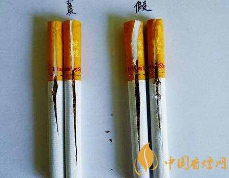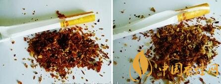 真品烟丝掺配均匀,烟丝颜色呈现出金黄色,油润性好,含烟末少;假烟烟丝劣质,烟丝颜色为淡黄色,烟丝掺杂质多,烟梗烟末多,与真品烟丝结构存在明显差异。