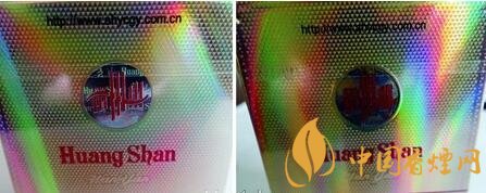 真品小盒背面定位烫金,其成像效果字体及图案清晰完整,且边缘无明显脱漆掉色;假烟仿造技术粗糙,特别是烫金图案内的黄山及“Huangshan”拼音字体无法完整呈现出来,与真品烫金工艺存在明显差异。
