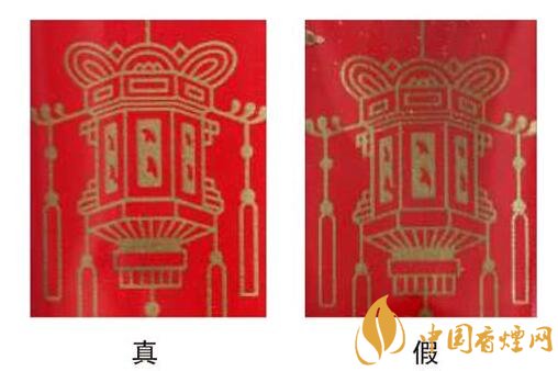 真烟“囍”字体红色色彩均匀,白色花型图案的线条较清晰;假烟“囍”字体红色色彩深浅不一,字体边缘锯齿状明显,白色花型图案整体较模糊。