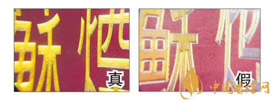 真烟烫金字体线条清晰、不漏金,金色部分成色纯正;假烟烫金字体线条不清晰,有漏金现象,金色部分成色暗淡。