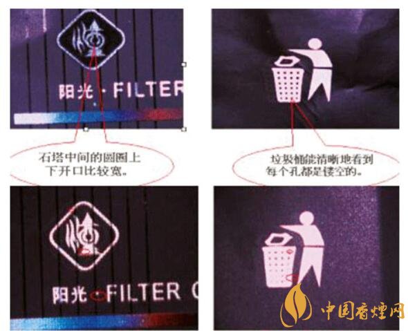 2.真品卷烟小包商标纸图案中,石塔中间的圆圈上下开口比较宽,而假烟一般开口比较窄。