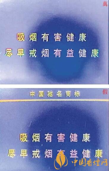 真烟的警示语字体边缘印刷清晰、平齐、无重影;假烟的警示语字体边缘印刷有重影、带毛边。