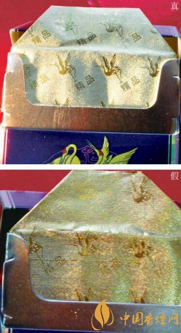 真烟内衬纸上鹤的图案和“精品”二字清晰、立体;假烟内衬纸上的图案和字则模糊不清。