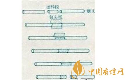 空腔滤嘴:空腔滤嘴是属于二元复合滤嘴的一种,二元复合滤嘴通常是一段滤材为醋酸纤维,另一段为皱纹纸或生产过程中掺入添加剂(如活性炭)的醋酸纤维。空腔滤嘴是属于后端为皱纹纸的那种,因为后端为中空,为了不使其塌陷,而醋酸纤维太软,所以利用皱纹纸做成中空型。因其有一段规则的空腔, 形成一个低压通道,抽吸时吸阻小, 能够显著提高对烟气中焦油的过滤效率,有效地减少焦油和一氧化碳的释放量。