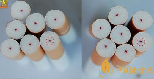如图五、图六红框标注所示,真烟的HCF过滤纤维(俗称红线)位于嘴棒中央,侧面呈规则圆形,假烟则形状各异参差不齐。有些假烟,中间的红点是印刷上去的。