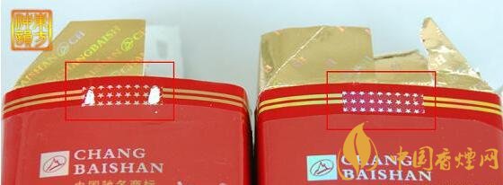 如图一、图二白色框标注所示,真烟外包装采用专用纸张印刷,条包和小包图案及文字颜色一致,颜色光亮、鲜艳,字迹清晰、完整,表面着色均匀、富有光泽,"长白山"三字凸感明显。假烟商标图案印刷粗糙、不清晰,文字有偏色、烫金色泽黯淡,字迹不清,表面着色不均,光泽差且模压图案或文字凸感不够。真烟烟盒表面有明显的竖条纹,假烟则没有。