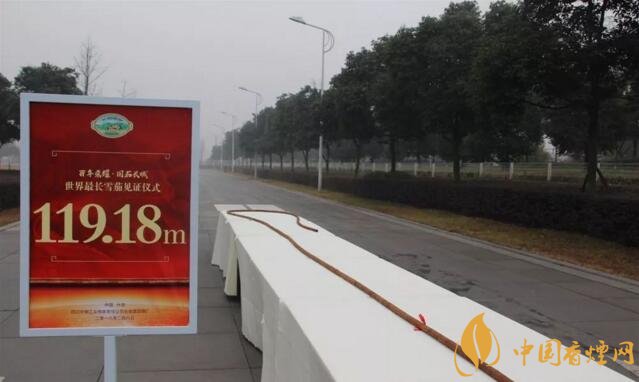 目前,国内最长的雪茄是——长城雪茄(119.18米)。据小编了解,这款雪茄的诞生是为了庆祝长城品牌历经60载岁月洗礼。雪茄的茄衣、茄套、茄芯烟叶共计耗用118公斤,烟叶选自多米尼加、印尼和中国“毛烟”产区等国内外优质雪茄原料主产区,全都经过8年以上自然醇化,由性矿泉水湿润处理后人工去梗,由“132特供小组”传人嫡传弟子、长城雪茄烟厂三位卷制大师共同卷制而成。