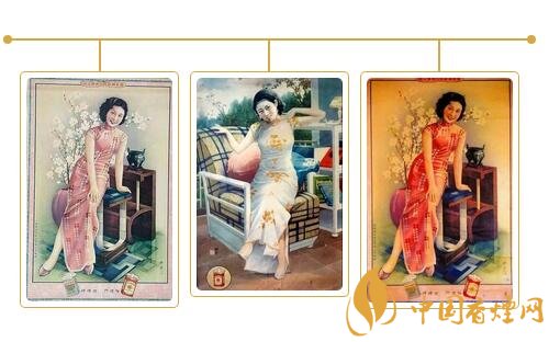 民国时期的香烟广告,“美女”成为广告画中的绝对主角,使得广告散发出诱人的女性魅力,以迎合和吸引大众的注意力。而在当时红极一时的哈德门香烟,全国各大中城市的巨幅广告牌比比皆是,触目可及。为了促销增收,除大张旗鼓地推出各类广告外,还在每盒烟中配有画片一枚,供欣赏收藏。画面皆为摩登美女,印刷精美,色彩靓丽。画片背面亦印有广告词“哈德门香烟人人爱吸”。据查,美女共有百名,这些活泼自信,烫发,穿高跟鞋,旗袍高开叉的“香烟美女”,服饰发型和神态各有千秋,情态纷呈,不管是读书、梳妆,还是玩乐,无一不让人感受到美感带来的视觉冲击。一枚拥有,即思百枚。