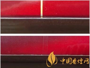 2.云烟字体印刷。真品卷烟云烟字体烫金印刷明亮、清晰、完美。字体笔画中间凸起,边缘凹陷,字体饱满,整体立体感强。侧光观察商标纸表面呈现磨砂状,红色线条凸起。该款假冒卷烟云烟字体烫金印刷颜色暗,笔画烫金掉金。字体笔画整体平,无立体感,印刷较为粗糙。侧光观察商标纸表面无磨砂状,红色线条平。图2上真下假