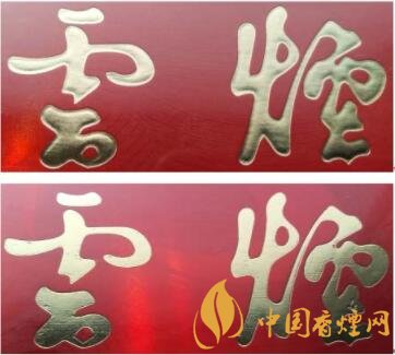 5.云烟商标图案。条盒背面云烟商标图案,真品卷烟图案颜色明亮,凹凸分明,立体感强,细节处理完美,烫金无漏烫现象。圆点图案烫金为实心,呈现金银色。该款假冒卷烟图案立体感差,部分图案烫金出现掉金现象。圆点图案烫金为镂空,呈现红色。
