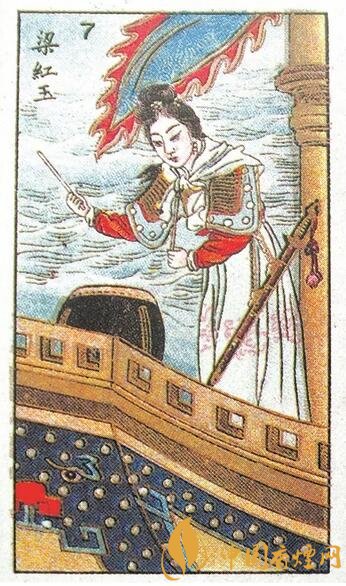 和兴烟公司出品的“岳传”烟画,全套100枚,其中第7枚为“梁红玉”(上图),画面取材自脍炙人口的“梁红玉击鼓抗金兵”的故事。烟画上,梁红玉身披战袍,临危不惧,亲擂战鼓,英姿飒爽。同时期,中国江浙烟公司出品的“历代名女”烟画之“梁夫人”、中美烟厂有限公司出品的“历代名人传”烟画之“梁红玉”,也展现了类似的场景。
