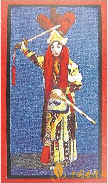 英美烟公司出品的“著名京剧演员剧照”烟画,70枚一套,其中第28枚为“尚小云之秦良玉”(上图),为照片版,展现了著名京剧演员尚小云扮演的秦良玉身着戎装、手持宝剑的形象,背面则印有人名、剧名及演员简介。