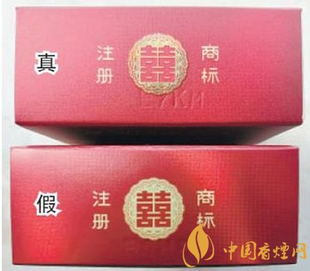 真烟背面中间“花球”激光镭射立体感强、层次分明、图案清晰、且“囍”字在花球中间位置;假烟背面中间“花球”激光镭射无立体感、层次不清、图案较模糊,且“囍”字明显偏离中间位置。