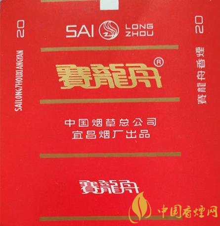 中国烟草总公司宜昌烟厂于上世纪80年代出品的“赛龙舟”烟标(已停产),标面呈赭红色,无主图,正版中心是美术化的“赛龙舟”品牌名,造型如龙舟的形象,其右上方有一个圆形注册商标标识宛似龙舟的龙头;