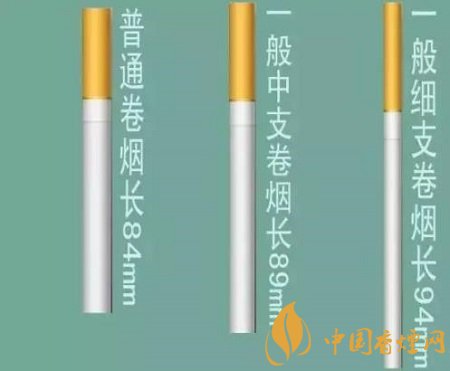 从烟支长度上看,常规卷烟长度为84mm,金中支为89mm;细支卷烟一般长94mm,中支卷烟比大部分细支卷烟短5mm。