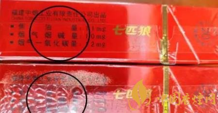 1、商标纸上的“七匹狼”商标图案:真烟套印准确,烫金饱满,色泽鲜亮,图案生动,立体感强。假烟烫金套印容易出现错位,烫金处会出现漏金现象,颜色相较真烟暗沉,立体感差。(左真右假)
