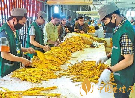 集中分级加工方式。烟农自行组织烘烤,烤后烟叶由合作社组织专人进行去青去杂,烟站对照工商交接样品按部位进行定级、过磅、结算。此模式的优势是减少分级环节用工成本,确保等级纯度。