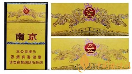 南京(九五)香烟以 “二龙戏珠”、“城墙”为主图案,体现了古都南京特色,以代表黄河文明的黄色主色调,庄重、典雅。吸味突出自然烟香,香气高雅绵长,烟气柔和细腻,抽后舒适、生津、回甜、无刺激,真正达到“柔、绵、醇、香”之意境。现就该卷烟小盒鉴别方法介绍如下: