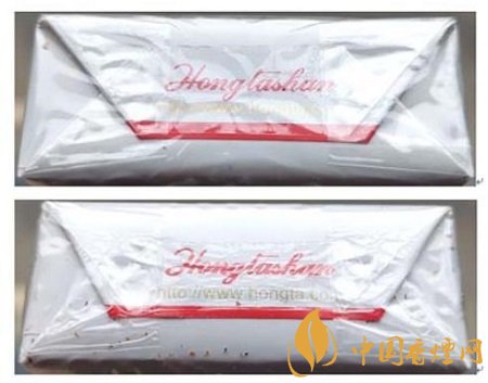 假冒卷烟:该款假冒卷烟印刷胶印,颜色交界边缘无锯齿痕迹;红塔图案模糊。(左真右假)