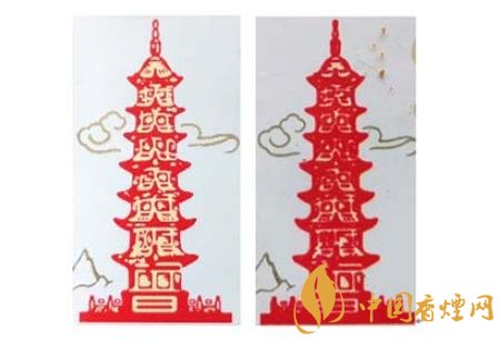 真品卷烟:红塔印刷采用凹印,颜色交界边缘有锯齿痕迹;红塔图案红色与浅黄色印刷清晰。