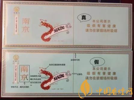 看条盒颜色,真烟为淡蓝色,颜色柔和纯正;假烟为浅蓝色,视觉上颜色不是自然色。看条盒图标,真烟“南京”二字字体端正清晰,龙须印刷图案无重叠,龙身金线为凸版,条盒金边无毛刺;假烟“南京”二字字体向左微倾,龙须有叠痕错层,龙身颜色为褐红色、金线为凹版,条盒金边有毛刺。