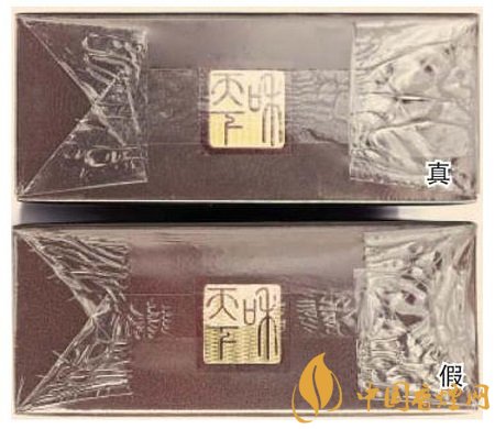 真烟商标纸采用复合镭射银卡纸,胶印和丝网印刷,“和天下”字体采用压凸烫金工艺,用手摸凹凸感较明显,且字体笔画较粗,商标纸上字体、拼音、花纹看上去有较清晰的竖线;假烟一般为高清扫描仿制印刷,“和天下”字体用手摸凹凸感不明显,且字体笔画较细,商标纸上拼音、花纹等处竖线较模糊。