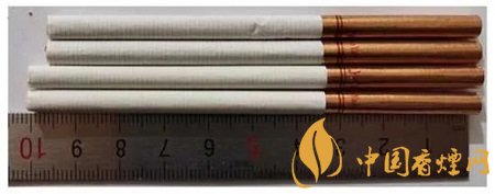假冒卷烟:该款假冒卷烟烟支长度为97mm,滤嘴处也有四排打孔,但不透气。卷烟纸颜色呈现暗灰色,眼观或手摸烟支松,烟支端部空头严重。烟丝较碎,有烟筋,烟丝色差较大。(上假下真)