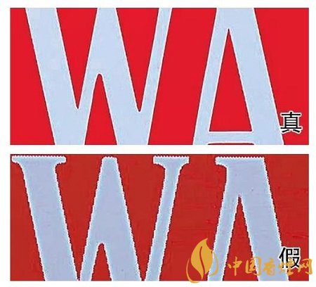 6、真烟白色字体边缘规整光滑,字迹饱满;假烟白色字体边缘粗糙,色彩污浊,有明显锯齿印。