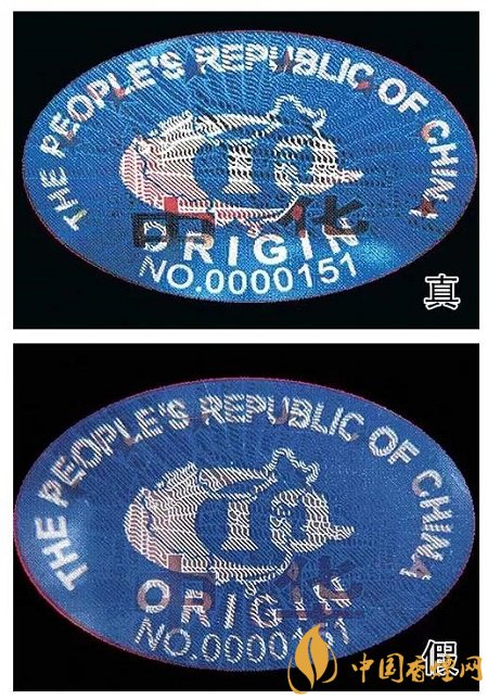 4、“中华”原产地标志为蓝色椭圆形,折光可见“中华”字样、8颗“★”及天安门图案。真烟色彩饱满,图案清晰;假烟色彩暗淡,图案模糊。