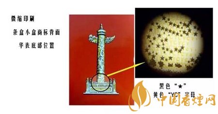 5、用放大镜查看条盒小盒商标背面华表底部位置,可以看到黑色“★”、黄色“YC”字母。