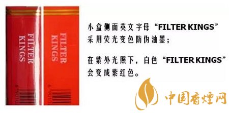 光变防伪涂层——小包侧面“FILTER KINGS”字样,经阳光直射或紫外光照射后由白色变成紫红色,停止照射后,紫红色会逐渐消退。