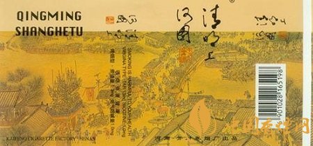 上世纪80年代,开封卷烟厂出品的“宋城”烟标,则采用广阔的全景画表现形式,选取了该画作的后半部分:只见高大的城楼两侧的屋宇鳞次栉比,街市行人摩肩接踵;士农工商、男女老幼、三教九流,无所不备。