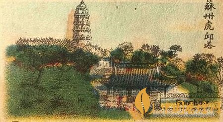 江苏苏州虎丘塔又称云岩寺塔,始建于公元959年。塔系平面八角形,七级,是苏州现存的最古老的一座佛塔,是古城苏州的象征。画面上虎丘塔高高耸立于景色幽雅的虎丘山巅上。