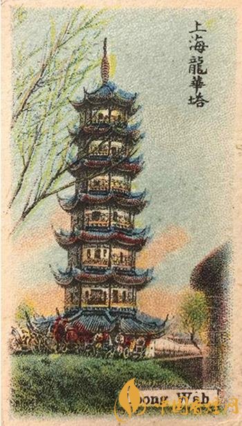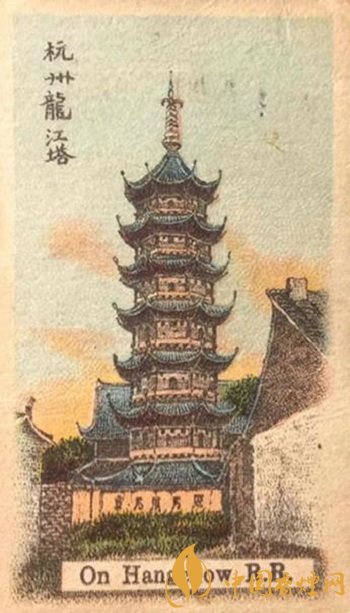 浙江杭州龙江塔何时始建暂时无考,从画面上可以看出是一座七级八面的精美古塔。可惜,现在这座古塔已荡然无存,我们也只能从这张小小的烟画上来领略这座古塔的风韵。