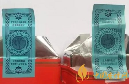 真品卷烟的封签纸印刷清晰、细腻,中间的东方明珠塔尖指向正面;假烟封签纸印刷模糊、粗糙,中间的东方明珠塔尖指向背面。