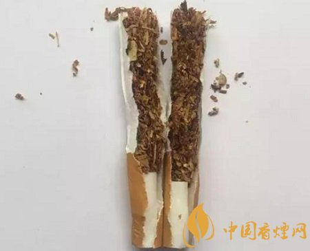 真品卷烟烟丝呈金黄色、丝条状,香气绵柔;假烟烟丝呈棕黑色,含末量大,香精气味浓烈。