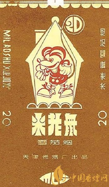 上世纪80年代,天津卷烟厂出品的“米老鼠”烟标,则为我们展示了一只卡通米老鼠的形象。该标主副版均为长着圆圆耳朵的米奇老鼠在妙妙屋中生活的画面,其形象洋溢着美式卡通特有的调侃、乐天、嬉皮、滑稽的美国文化精神,米老鼠是有着卡通天才、娱乐业大王之称的美国人沃尔特·迪尼斯精心打造的卡通形象。