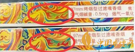 如下图标示,此处图案真烟为蓝色,假烟则变成了绿色;真烟的线条为黄色,假烟变成了红色;真烟为绿色的圆珠外面为蓝色的底色,假烟都变成了绿色。(上假下真)