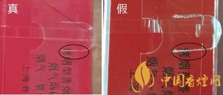 真品小盒拉带头为方头圆角,边缘光滑无毛渣;假烟小盒拉带头形状为平头圆角,边缘不够光滑,有毛渣。