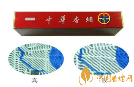 “中华”原产地标志为蓝色椭圆形,折光可见“中华”字样、8颗“★”及天安门图案。真烟色彩饱满,图案清晰;假烟色彩暗淡,图案模糊。同时还可以借助图中蓝色线的走势来区分真假烟。