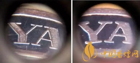 真品卷烟金腰带顶部YUNYAN拼音,笔画内有横线条痕迹。该款假冒卷烟字母笔画内无横线条痕迹。图4左真右假(左真右假)