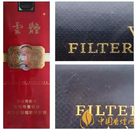 真品卷烟云烟字体烫金印刷明亮、清晰、完美。字体笔画中间凸起,边缘凹陷,字体饱满,整体立体感强。侧光观察商标纸表面呈现磨砂状,红色线条凸起。该款假冒卷烟云烟字体烫金印刷颜色暗,笔画烫金掉金。字体笔画整体平,无立体感,印刷较为粗糙。侧光观察商标纸表面无磨砂状,红色线条平。(上真下假)