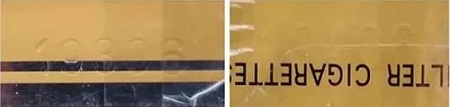 真品卷烟钢印打印的数字感觉较为粗糙,有力度感且排列不整齐。该款假冒卷烟钢印打印比较轻,无力度感且排列整齐。(左真右假)