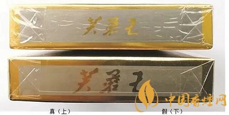 假冒卷烟“芙蓉花”图案立体感不强,金色长方形外边框上无细小压痕。