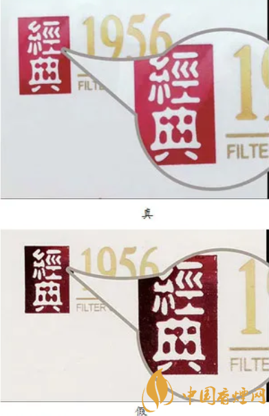 真烟条盒上的“经典”二字笔划清晰、有立体感;假烟条盒上的“经典”二字笔划粗糙、字迹模糊。